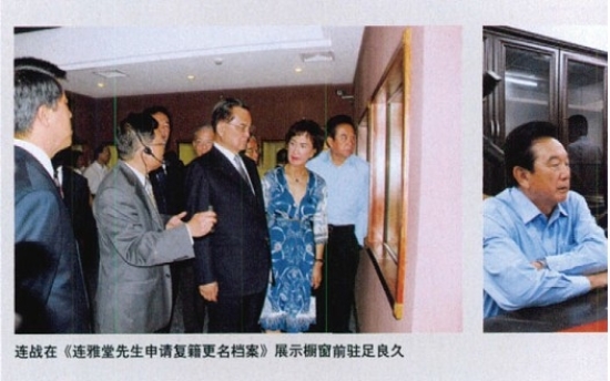 来到《连雅堂先生申请复籍更名档案》展示橱窗前,讲解员向连战先生介绍二史馆副馆长曹必宏(右一)向连战介绍“中央设计局全宗”档案里有关连震东先生的部分二史馆馆藏北洋政府内务部有关连雅堂先生复籍档案了档案馆工作人员从二史馆馆藏北洋档案中发现并制作高仿真复制件的情况。看到6年前收到的档案的原件时,连战先生难以抑制激动的心情,在展品前驻足良久。合影留念时,细心的连战先生叮嘱随行摄影师:“多照几张,(镜头里)一定要有档案原件!”他恋恋不舍地离开时,不曾想到还有更大的惊喜等着他。
