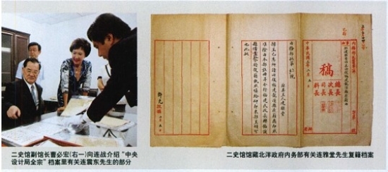 从此以后,连战知道了南京有一家档案馆,不仅收藏国民政府时期的档案,还完整保存了他祖父的档案。2011年展开大陆之行时,连战先生便和夫人一起到访了二史馆。