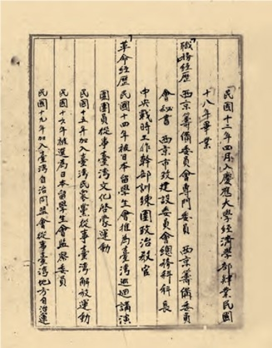连雅堂在给张继的信中有言:“今者南北统一,偃武修文,党国前途,发扬蹈厉,属在下风,能不欣慰!儿子震东毕业庆应大学经济科,现在台湾从事报务,弟以宗邦建设,新政施行,命赴首都,投奔门下……弟仅此子,雅不欲永居异域,长为化外之人,是以托诸左右。昔子胥在吴,寄子齐国,鲁连蹈海,义不帝秦,况以轩黄之华胄,而为他族之贱奴,泣血椎心,其何能惄?”对国之忧心、对儿之期望,跃然纸上。