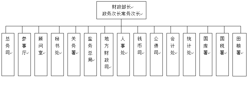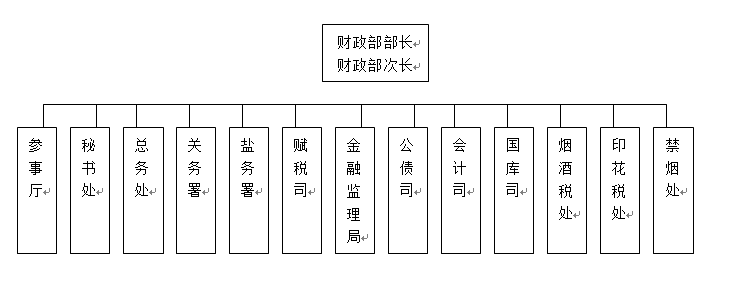 有:参事厅、秘书处、视察室、关务署、盐政司、税务署、总务司、赋税司、公债司、钱币司、国库司、会计处及各种委员会。各厅、署、司、处职掌如下: