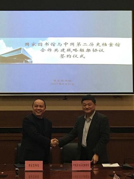 4月11日,中国第二历史档案馆与国家图书馆在北京举行合作共建战略框架协议签约仪式。中国第二历史档案馆馆长马振犊、国家图书馆常务副馆长陈力分别代表两馆签署了合作共建战略框架协议。中国社会科学院近代史研究所所长王建朗、北京大学历史系教授王晓秋、国家博物馆副馆长白云涛等十一名专家学者共同见证了本次签约仪式。