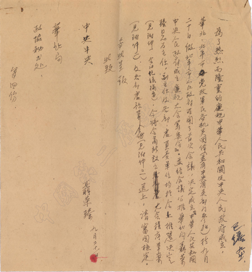 庆祝大会筹委会主任聂荣臻为庆祝大会筹委会成立事致中共中央、华北局、政协秘书处报告稿(1949年9月21日)