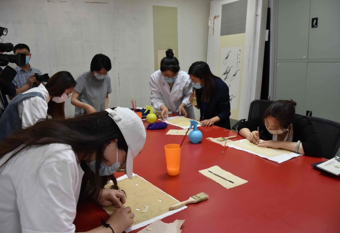 在档案修裱室,为使人们对档案修复工作有更直观、更深刻的了解,“档案工作特色之旅”特意安排了档案修裱工作体验,采取参与互动的方式,指导大家开展档案修复实操。只见档案修复“医生”在朱砂红漆案的“手术台”上,熟练操作镊子、排笔、棕刷等“手术工具”,经过铺平、刷浆、补残缺、上纸、排实、上墙、晾干等环节的修复,破损档案重获新生,参观者赞叹不已。