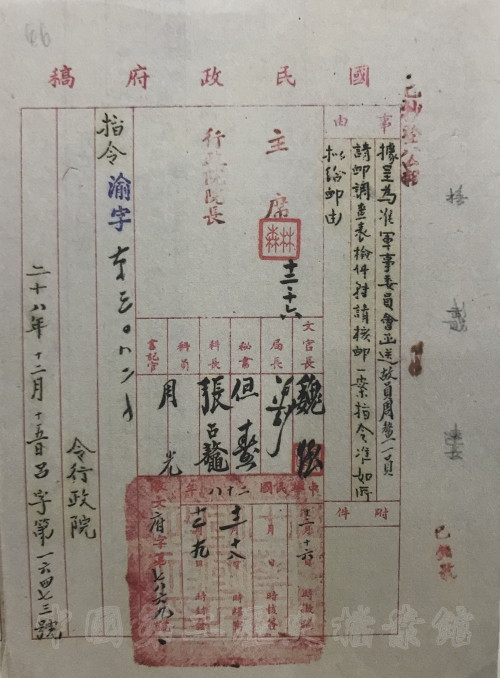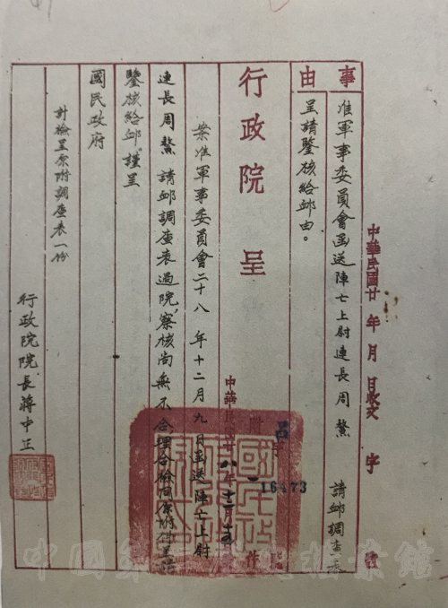 ▲ 1939年12月,行政院请恤陆军第87师阵亡上尉连长周鳌呈及国民政府准予抚恤指令