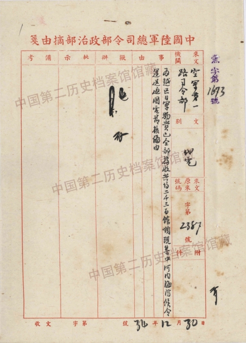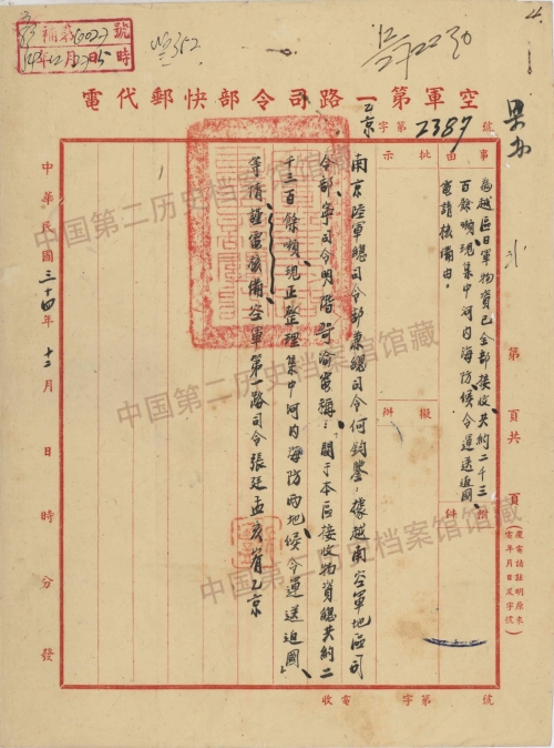 1.空军第一路司令部报告北越地区日军物资接收情形致陆军总司令部代电(1945年12月26日)