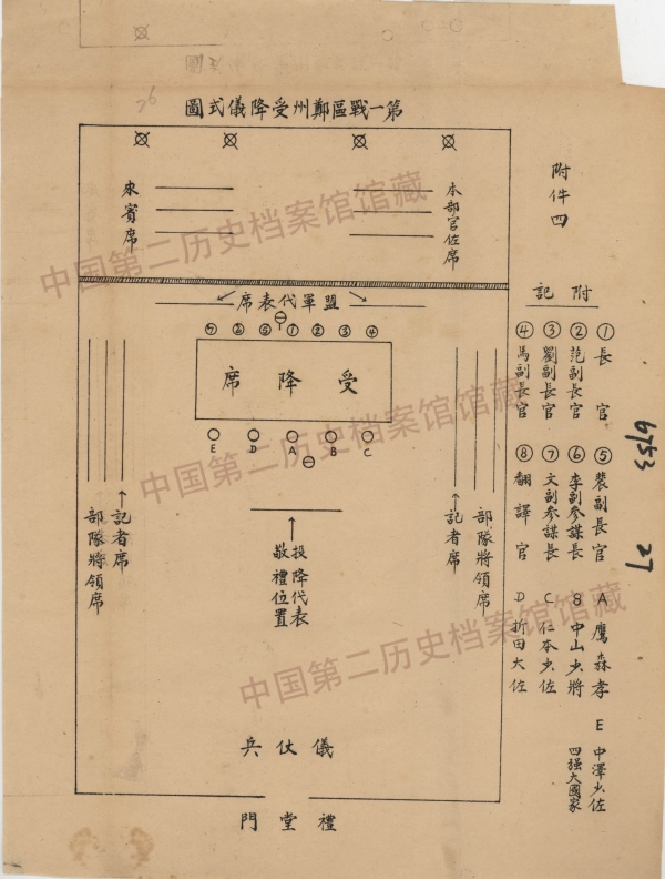 第一战区受降区原定为洛阳地区,后改为洛阳、郑州、开封、新乡地区,受降地点由洛阳改在郑州,受降主官为胡宗南。该区日本投降代表为侵华日军第12军司令官鹰森孝,日军投降部队共计4.3万余人。1945年9月22日,胡宗南在郑州前进指挥所礼堂接受鹰森孝投降。