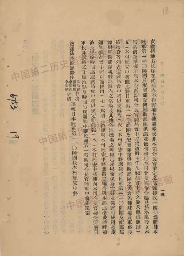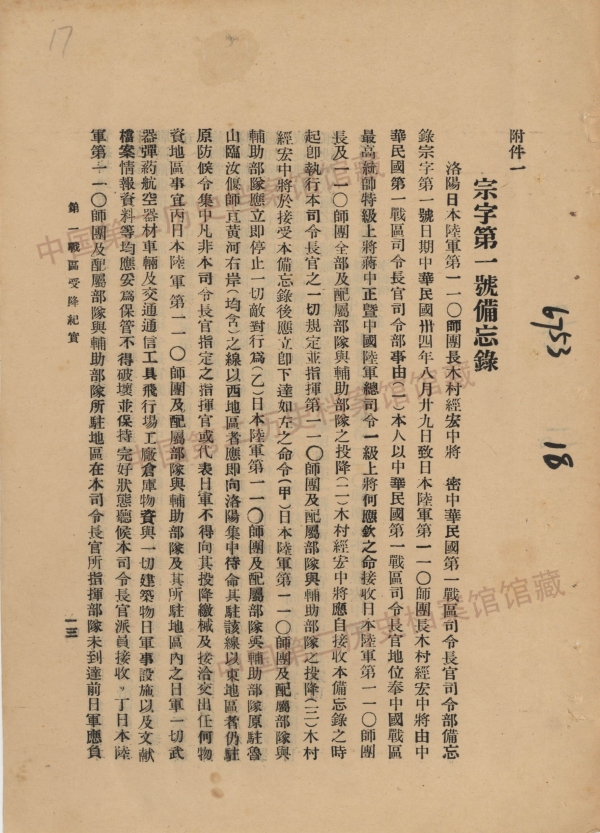 3.胡宗南致洛阳日军投降代表木村经宏宗字第一号备忘录(1945...