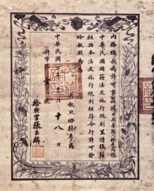 辛亥革命后帝制终结、民国肇建,给眷怀祖国的台湾同胞带来了希望。1913年,不甘受“倭奴之辱”的林祖密放弃庞大家产,向日本驻厦门领事署申请撤销日本国籍,并依照刚颁布的《中华民国国籍法》,向北洋政府内务部申请恢复中国国籍。11月18日,内务部核发林祖密恢复中国国籍的“许字第一号”执照,林祖密成为台湾被日本殖民统治后正式恢复中国国籍的第一位台湾同胞。恢复国籍后,日本台湾总督府以没收或低价收购的方式侵占其在台的大部分产业,所遗财产不及原来的十分之一。