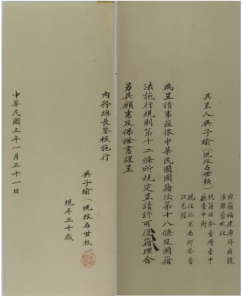 北洋政府颁布《中华民国国籍法》后,吴子瑜在林子瑾的引导下,于1914年1月31日赴内务部办理复籍手续。在给内务部的呈文中,他写道:“具呈人吴子瑜(现改名世勳),原籍福建漳州府龙溪县蔡墘社,现籍日本台湾台中厅台中街……兹依《中华民国国籍法》第十八条及《国籍法施行规则》第十二条所规定,呈请许可复籍。”2月4日,内务部批复:“自应照准。除由部注册并令行福建民政长转饬该县备案外,并将复籍执照填给,仰即具呈遵领。合行批示。”