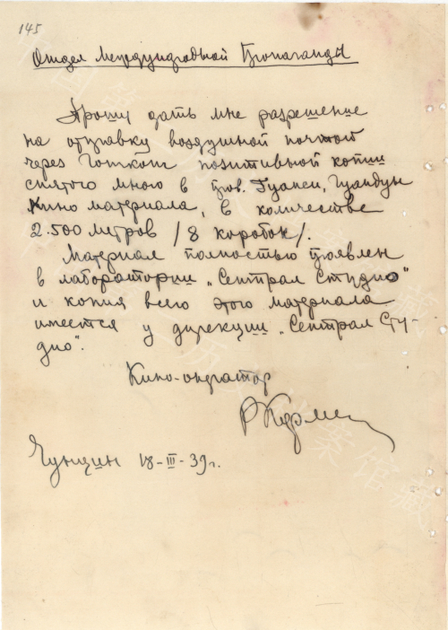 卡尔曼手迹:1939年3月8日,卡尔曼写信给国民党中宣部国际宣传处,请求准许将其所拍摄的中国粤桂两省新闻底片寄回苏联。(中国第二历史档案馆藏)