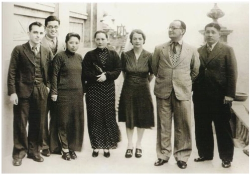 1938年,爱泼斯坦(左一)应宋庆龄(左四)邀请前往香港,参与保卫中国同盟的筹建工作。