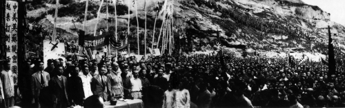 1944年6月13日,在延安文化沟,中外记者西北参观团参加了2.5万人的军民集会,庆祝诺曼底登陆暨欧洲反法西斯第二战场开辟(前排左七为爱泼斯坦)。