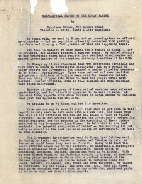 1942年夏秋,“河南大灾荒的消息传入重庆,如同随风飘入的柳絮”,难以获取任何确切信息。1943年2月,白修德与美国记者哈里森·福尔曼一同前往河南,实地调查灾荒情况,目睹的却是“国民党政府无动于衷地看着人民被饥饿夺走生命”。他在日记中写道,在我离开河南时,郑州官员设宴款待,这是“我平生吃到的最漂亮和最不忍吃的一席菜”。失了民心的国民党,最终在1944年的豫湘桂战役中丢掉了河南。