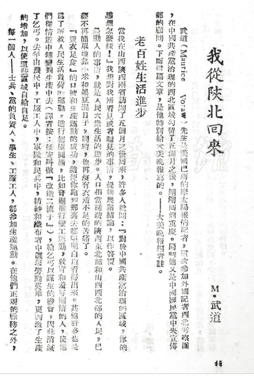 1944年10月,武道结束延安及晋绥边区之行,从延安返回重庆。在为期五个月的实地采访中,他目睹了中国共产党领导的抗日根据地的真实面貌,此前对敌后战场抱有的错误认知也随之改变。回到重庆后,武道撰写《我从陕北回来》一文,发表于《大美晚报》,文章分“老百姓生活进步”“土地革命已停止”“医药设备不够用”“人民都有选举权”“适应抗战的学校”“强烈的抗战意志”“言论出版自由”“我看见了战斗”等八个部分,如实记述了他在边区的所见所闻,对中国共产党领导下的敌后抗战给予了积极评价。